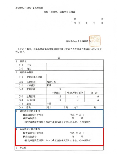 上記が台帳記載事項証明書と言う書類になりますが、青枠には建築確認を取得した際の日付と許可番号が入ります。取得した際に、青枠に日付と番号の記載が無い場合は申請すらも行っていない建築物と言う事になります。